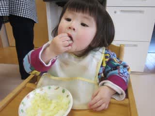 成長するにつれ”自分で食べたい”気持ちが芽生え、手づかみで口へ運びます。