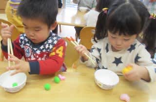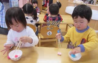 こちらは箸を使って… 近頃、箸に興味を持ち始めた1歳児さん。