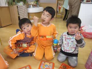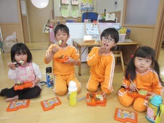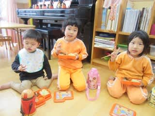 1歳児さんは3歳以上児のクラスへおじゃまし、一緒に食べました♪“お弁当の蓋を開けてお弁当箱の下へ置く”