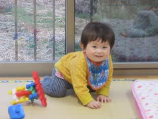 ちらっとカメラを構えている保育士に気づき、ハイハイしながら遊んで~って来てくれます(*^_^*)