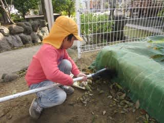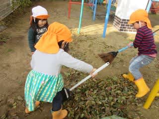 それを見た4歳児さんが、葉っぱをかき集め始めると、