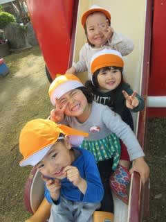 おやつ後の園庭あそびではご機嫌な笑顔のオンパレード