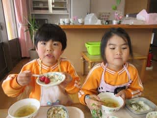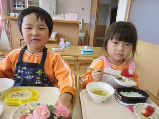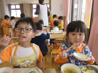 配膳準備中…「あ!ラディッシュ入っとる!」「ねぇ先生、これって〇〇(名前)が育てたラディッシュ?」