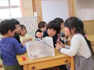 今日は、午前中、うす曇りのお天気。 よし、今日は、運動場の草むしりしようか?ということになり、早速運動場へ。軍手をして草むしりを頑張っている2歳児さん。集めた草や棒を袋に詰めている年長さん。「せんせい、団子虫がいっぱいい…