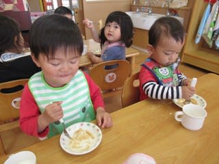 3歳児さんはお正月に向けて製作中・・・ 雪ダルマのような形 何だかわかりますか 今回はくり抜いた方の形を使います スポンジに絵の具をつけて、ペッタンペッタン ずれないように押さえながら、ペッタンペッタン 完成した作品は後…