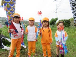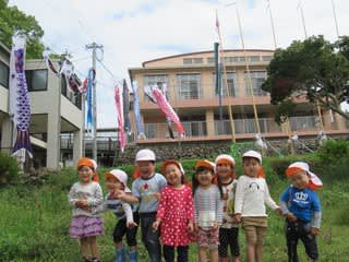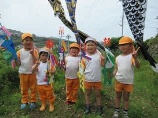 子ども達が制作した鯉のぼりと一緒にパチリ