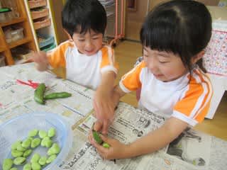 3・4歳児さんの保育室を覗いてみると・・・ みんなが持ってる、袋の中に何かが入っています! それは・・・ この時期の花!朝顔でした 今日は、朝顔をよーく揉んで色水作り みんなの力を合わせてモミモミ~ パックの中へ出し…