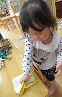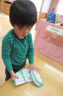 エプロンやタオルを自分でたたみます♪「はんぶんこ・はんぶんこ」と言いながら…(*^^)v