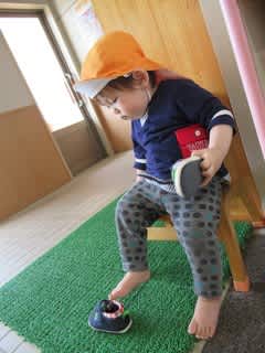 0歳児さんが玄関で一生懸命に靴を履いている姿を発見!!