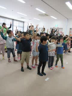 子どもたちが「わぁ~」っと見上げたそのさきには・・・ はい、しゃぼん玉です\(^o^)/ 風にのってゆらゆらと、虹色のシャボン玉に子どもたちは大喜び♪ みんなの元気な声に、どんより梅雨空もふっ飛びそうでした(*^_^*)