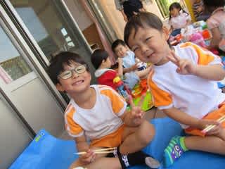 普段は保育室にて食事をとる2歳児さんも、雰囲気が変わったおかげか箸もいつもに増して進みましたよ(^^)v