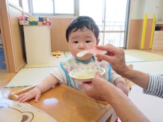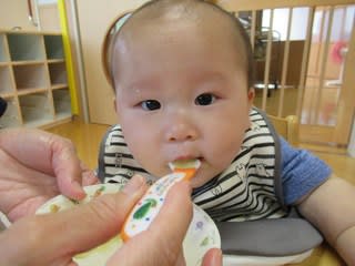 離乳食中期の0歳児さん、この日のおやつはりんごでした。