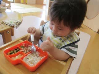 離乳食完了期の0歳児さんもスプーンをもって”自分で食べたい”の気持ちが芽生えてきましたよ(*^^*)