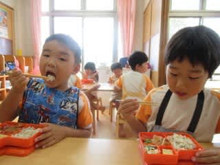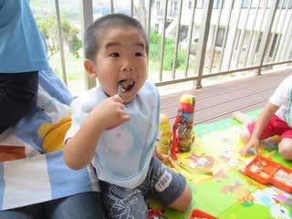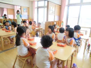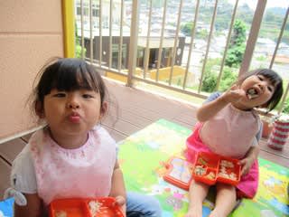 運動会の練習を終えた3・4・5歳児さんは保育室で1・2歳児さんはテラスで食べました