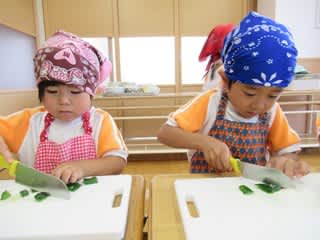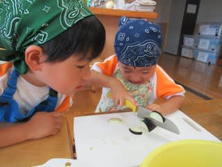 3歳児さんも包丁にチャレンジ!!真剣な表情の3歳児さんを心配そうに見つめる年上のお兄さん(*^_^*)