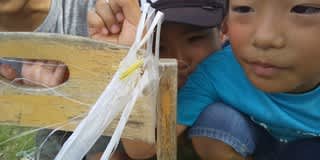 初めて見つけた黄色いバッタに大興奮の児童と保育士でした!