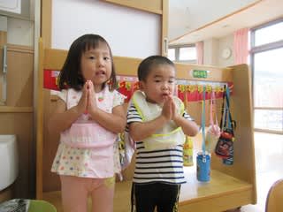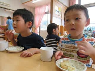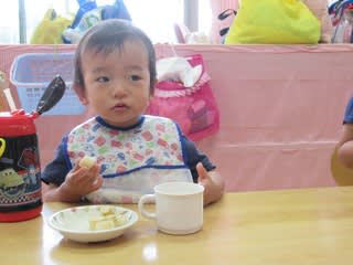 お当番さんの号令であいさつをすると、さっそくパクッ(^^)