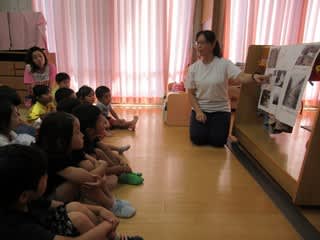 その後、紙芝居や台風被害に遭われた写真を使って