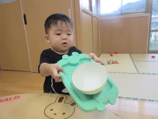 夕方の時間、0歳児さんはおままごの真っ最中でした。