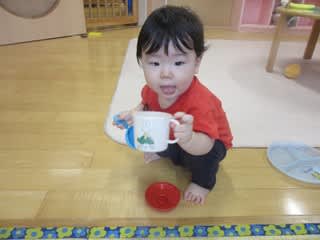 「ちゃっちゃっ」とお茶を飲む真似をしてみたりそれぞれが手にしたおもちゃで遊んでいましたよ(^^)