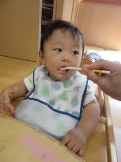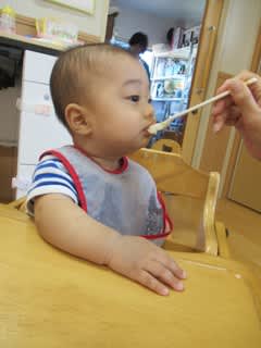 離乳食中期の0歳児さんもしっかり顎を動かし食べています(^^)