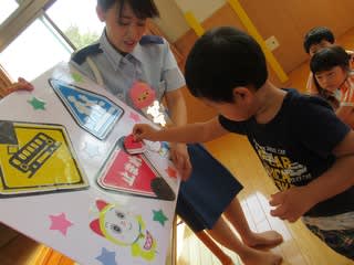 横断歩道や踏切の渡り方、道路で見かける標識についてのお勉強。