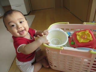 大きなかごに入っているおもちゃを取り出すのは一苦労。ですが、