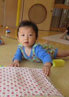 食欲の秋を思い出す製作のようすですね。糊付けも上手になりました。 0歳児だってほらこのとおり・・・ 12日から実習に来ている学生と「ハイポーズ」です。柿もおいしそうになっていますね。