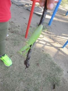 子どもたちが遊んでいるとカマキリがひょっこりとみんなのもとへ。