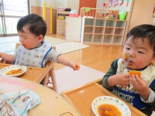 保育士に食べさせてもらうお友だちも、お皿の方へと手が伸びて
