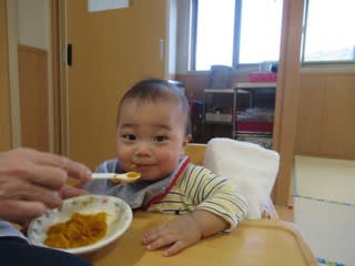 0歳児さんはおやつ時間に、かぼちゃのいとこ煮を食べました(^^)