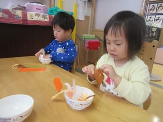 1歳児さんの給食時間です(^^♪ 目で見て、手で触って、お口へパクッ。 始めましての食材や味は、とても刺激的ですね✨ 手づかみ食べだったお友だちも、フォークを手にとり、 使ってみようとする姿が見られるようになりました。 …