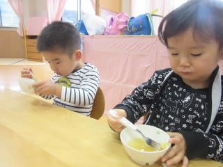 「お椀持って食べるとよ」と教えあう姿が見られる2歳児さん