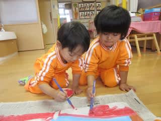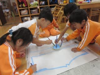 3.4歳児さんは大きな模造紙に何やらお絵かき中です(^^♪