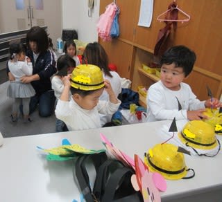 小道具を手に、「次はこれ被るとよね?」と確認してみたり♪0歳児さんもいつもの保育室とは違う部屋で出番を待ちました。