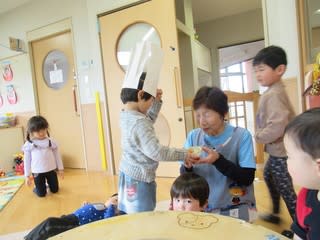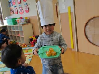 保育士からシェフの帽子を作ってもらうと一気にパティシエモード。