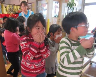 ちょうどおやつの時間だったので、おやつ片手に避難をする子も・・・
