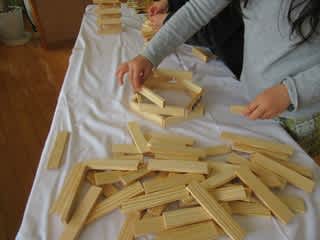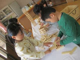 他のお友だちが午睡中の中、数人の子ども達は寝る事もなく…製作に取り掛かりました何が出来上がるのかな分からないところは、お隣の子に聞きます チョキチョキ真剣な表情です 出来上がったおもちゃは“くるくるヘリコプター”高いとこ…