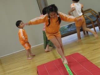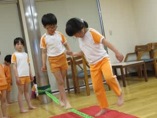 お友だちの手を借りて挑戦してみたり、一人でしてみたり…バランス感覚や集中力がないとすぐに落ちてしまいます