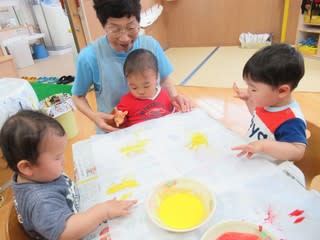 始めは、手が汚れるのを嫌がる子、絵の具の中に手を入れて感触を楽しむ子様々でしたが