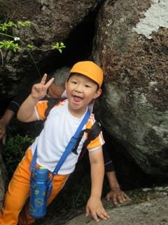 「大きな石のトンネル見つけたよ」「リュックが…こうしたら通れるかな?」と考えながら通り抜け...到着です