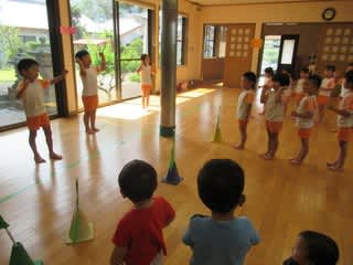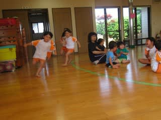 やっとお天気になり、みんな部屋から出ての活動でした。5歳児は、今、竹馬に挑戦中の子急増!自分のお尻ぐらいの高さまで乗れている子も・・・ 男の子は縄跳びを使っての遊びでをし…