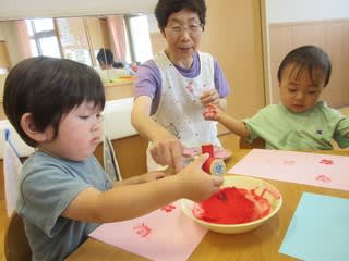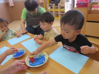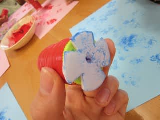 赤や青の絵の具に、ペットボトルのキャップで作ったハンコをぺったん!
