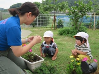 こちらは、花壇の花を入れ替えていたところに1・2歳児がやってきて