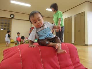 先日のスポキッズでは、『バランス』に挑戦しました!! グージャンプで飛んだり、片足づつ渡って行ったりしましたよ。 ボヨ~ンとなるので落ちないようにバランスをとりながら最後まで頑張った子ども達でした 最後まで行けたら先生と…