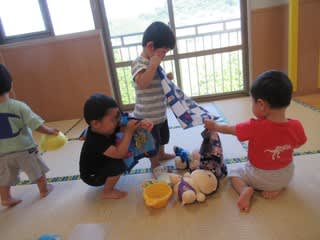 1日の頑張りを落ち着かせるようにゆったりと遊んでいる未満児さんたち