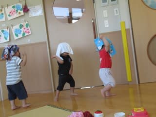 おままごとをしていたかと思えば、ハンカチを頭にかぶせて
