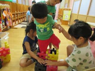 保育園児が小学生と一緒に大きな靴を作って、小さいクラスのお友だちに履かせてくれていました。