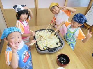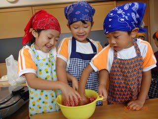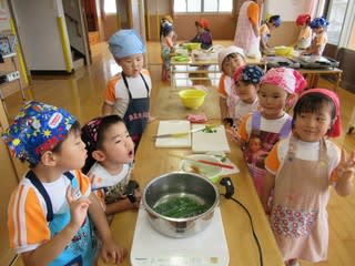 3歳児さんは野菜をゆでたり切ったり、切った野菜をハムで巻いたり大忙しでしたがお歌を歌いながら楽しく取り組むことができました