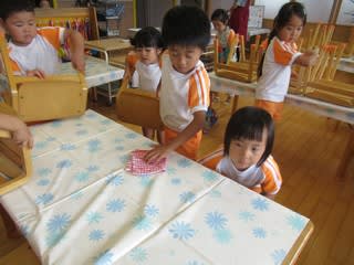 今日から3歳児さんも食後のお掃除に仲間入りしました